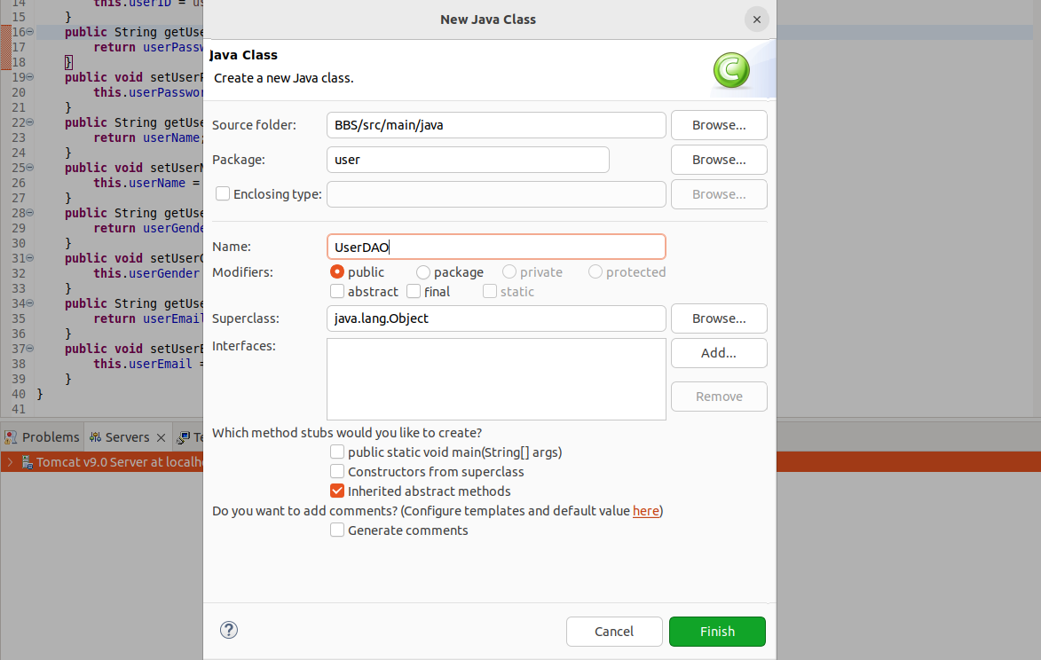 ①user 패키지에서 우클릭 - 'New' - 'Class' - Name을 UserDAO로 생성
