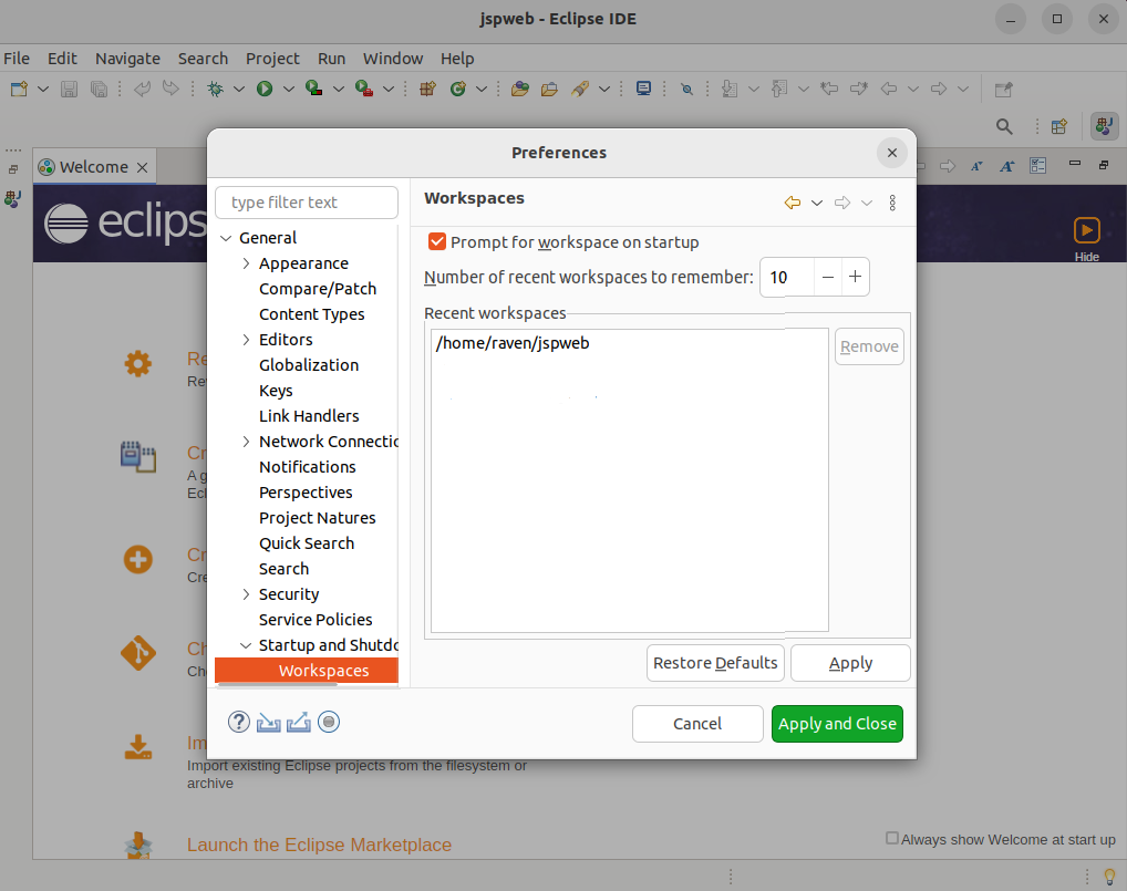 ①window-preference-general -startup and shutdown- workspace - prompt for workspace on start up