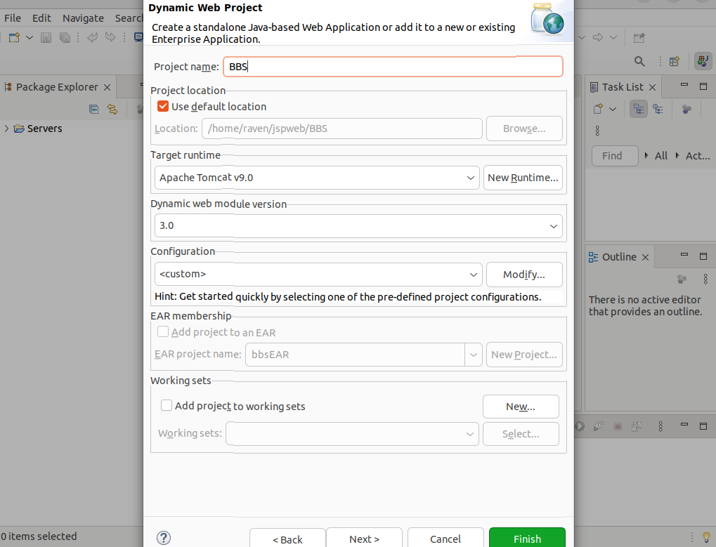 ⑤File-new-other 에서 'Dynamic Web project' 검색 및 선택 후, Project name / Dynamic web module version 입력, 'Finish' 클릭