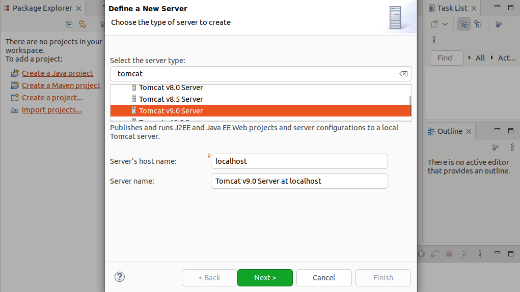 ④Servers 탭에서 "No servers are available. Click this link to create a new server..." 클릭 후 설치한 톰캣 버전에 따라 버전을 선택하고 Next 클릭