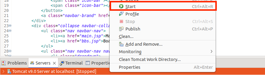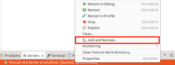 ⑦Servers 탭 아래 "Tomcat v9.0 Server at localhost" 항목에 우클릭 - Add and Remove 클릭.