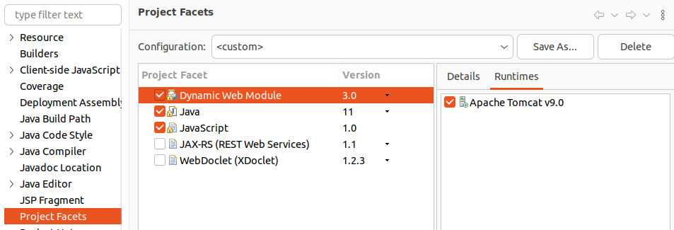 ⑥프로젝트 이름에서 우클릭 - Properties 클릭 - Project Facets 항목에서 Dynamic Web Module 옆에 Runtimes에 아까 생성한 서버(Apache Tomcat v9.0)로 체크되어 있는지 확인