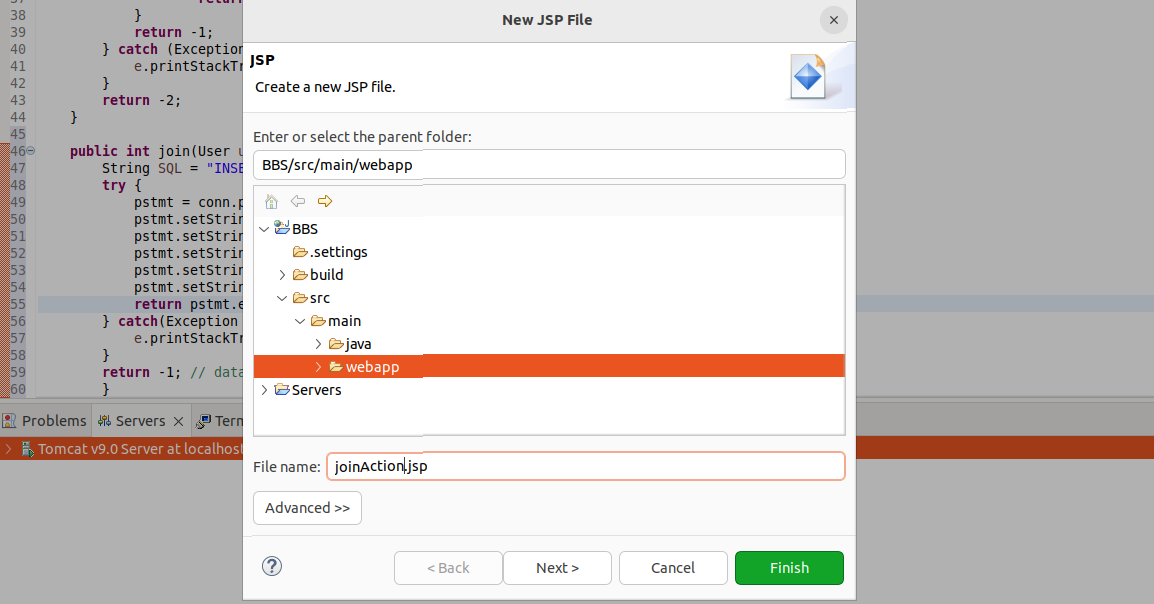 ①webapp 에서 'New' - 'jsp' - Filename에 'joinAction.jsp' 입력