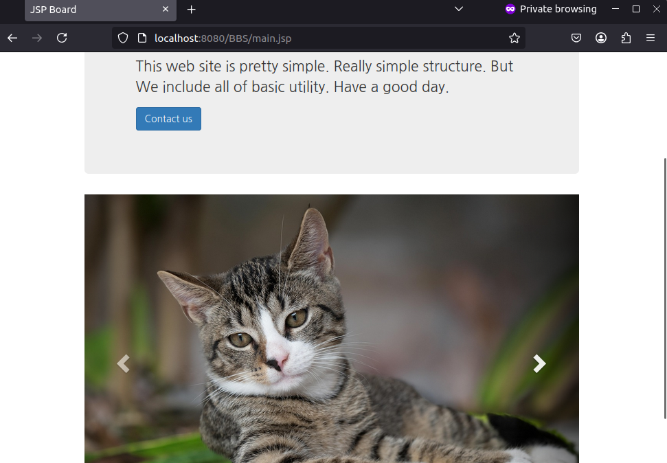 jquery 스크립트 위, 소개 문구 아래에 해당 코드를 추가합니다. 이 코드는 BootStrap에서 제공하는 "Carousel"이라는 기능이며, 사진첩처럼 좌우로 사진을 넘길 수 있는 기능입니다.