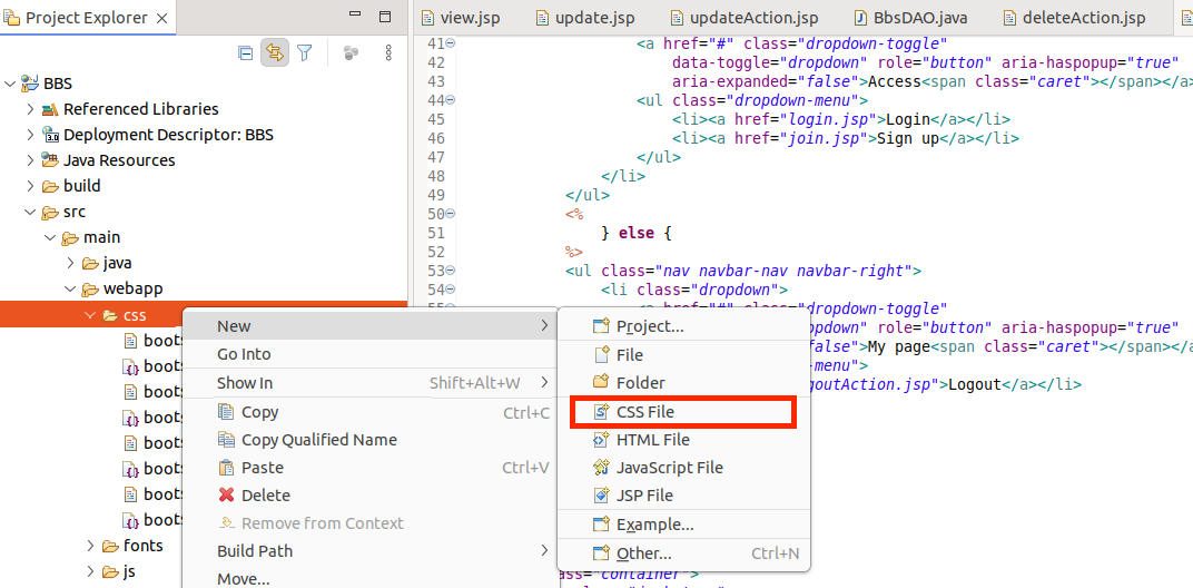 ①webapp-css 에서 'New' - 'Css File' 클릭 - 'custom.css' 작성